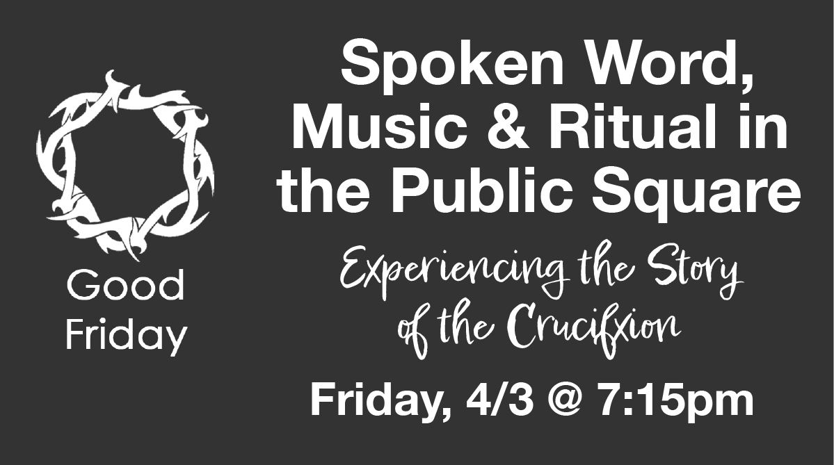 Come to our traditional gathering of spoken word, music and ritual in the public square. We are having our gathering inside the sanctuary, and ending our time together outside at the foot of the cross by candlelight with prayer and singing. (no more than 45 minutes)
